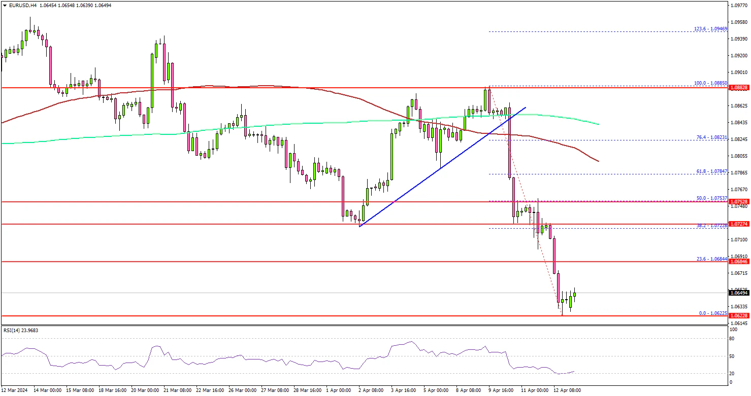 EUR/USD dived below the 1.0750 and 1.0720 support levels. It even settled below the 100 simple moving average (red, 4-hour) and the 200 simple moving average (green, 4-hour).