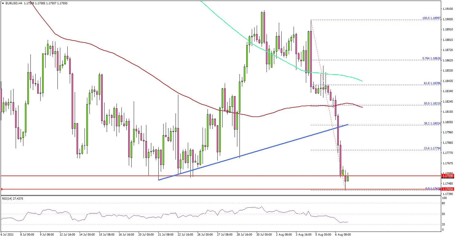Finally, the pair traded below the 1.1755 support zone. A low is formed near 1.1742 and the pair is now consolidating losses.