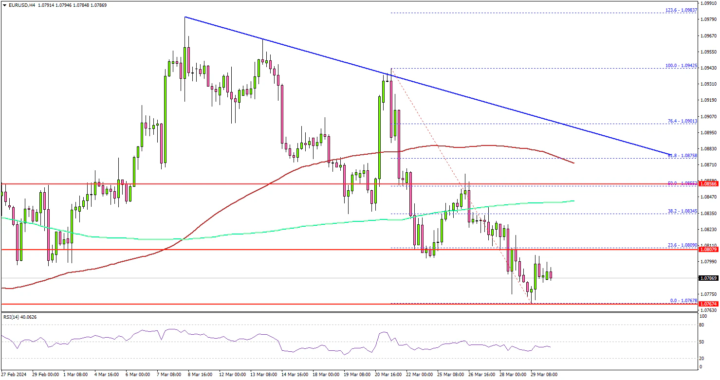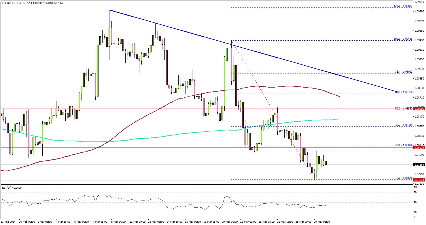 - EUR/USD started a fresh decline below the 1.0820 support zone.