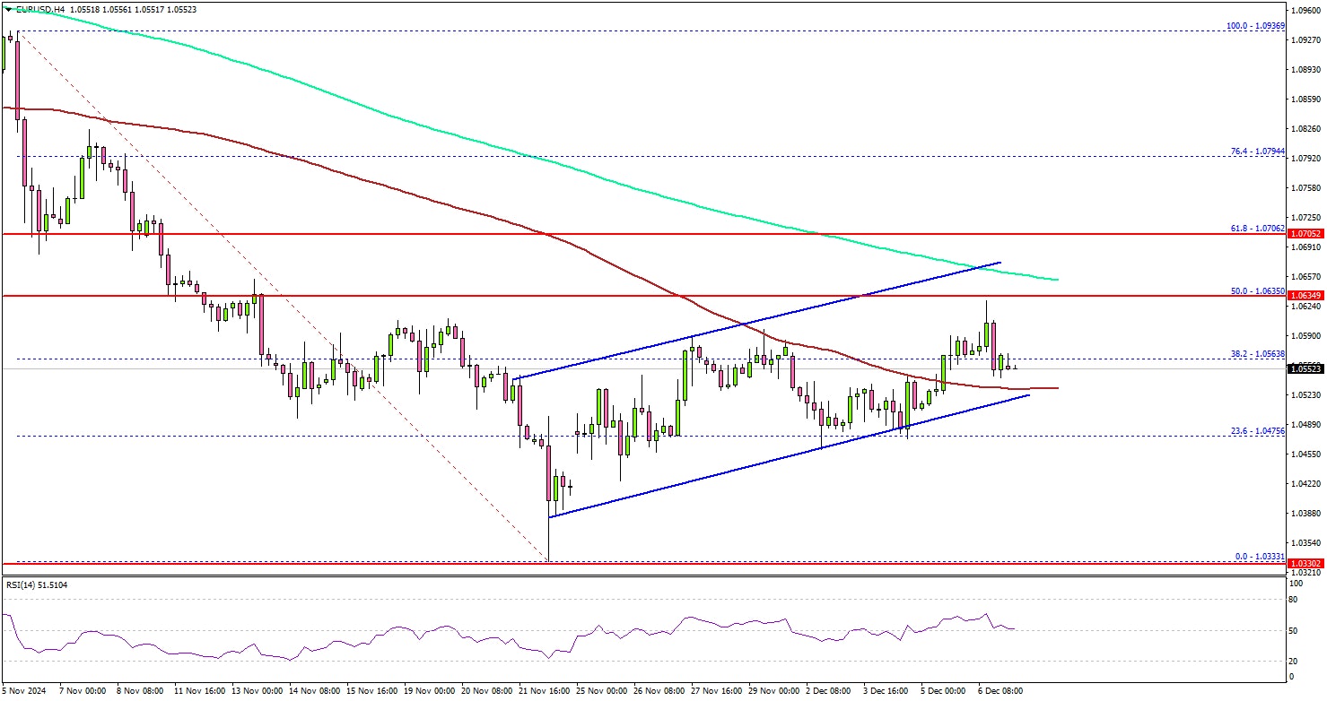 • A key rising channel is forming with support near 1.0500 on the 4-hour chart.