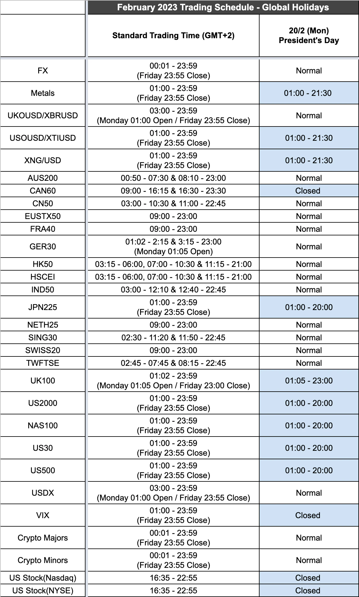 Due to US President’s Day, the market trading hours for a number of tradable products will be altered late in February.