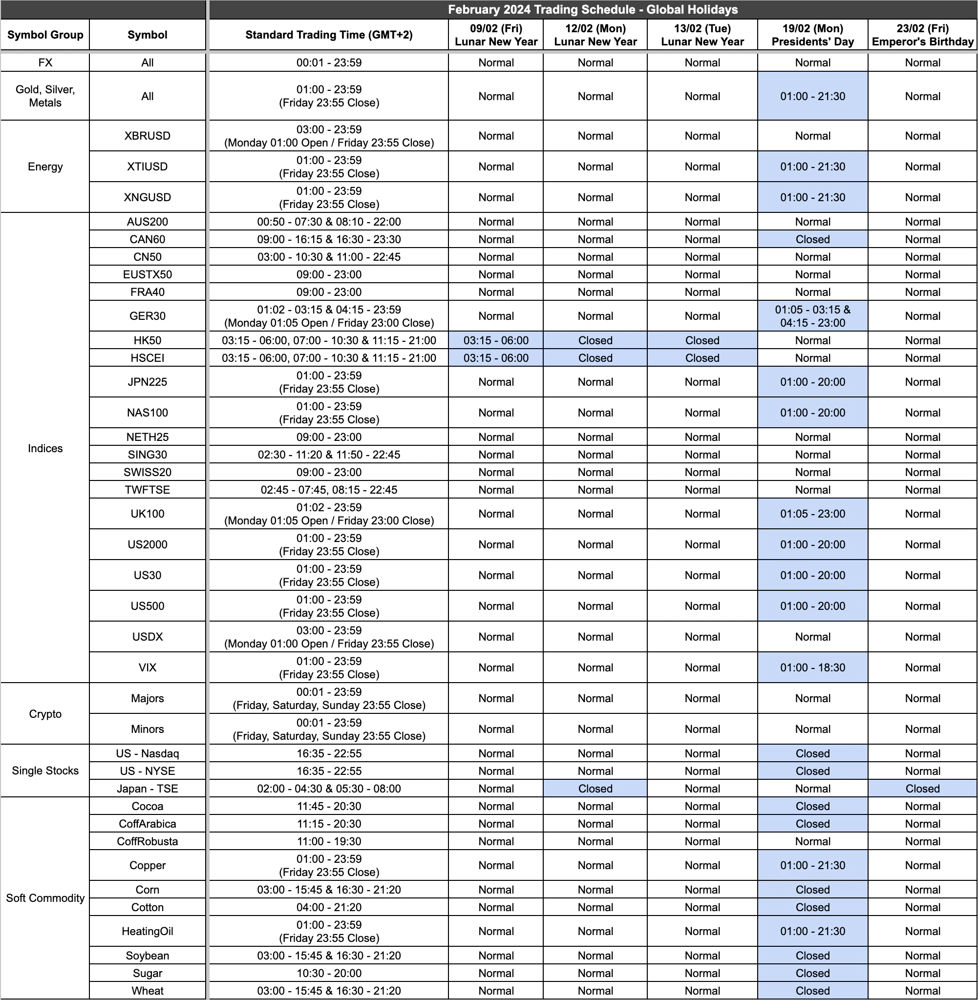 Due to Lunar New Year, Presidents’ Day, and Emperor’s Birthday, the market trading hours for a number of tradable products will be altered in February.