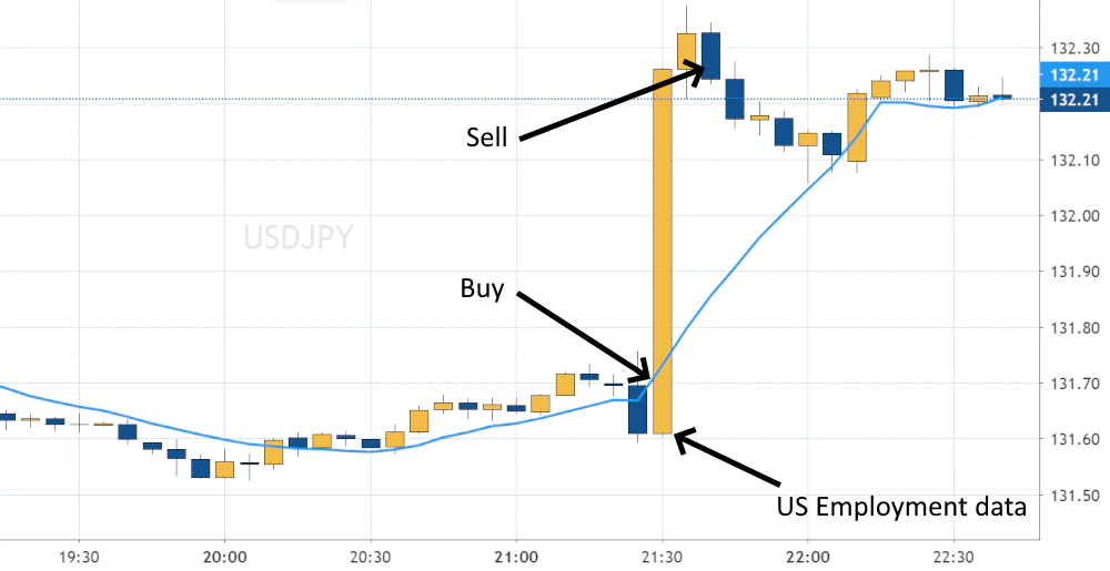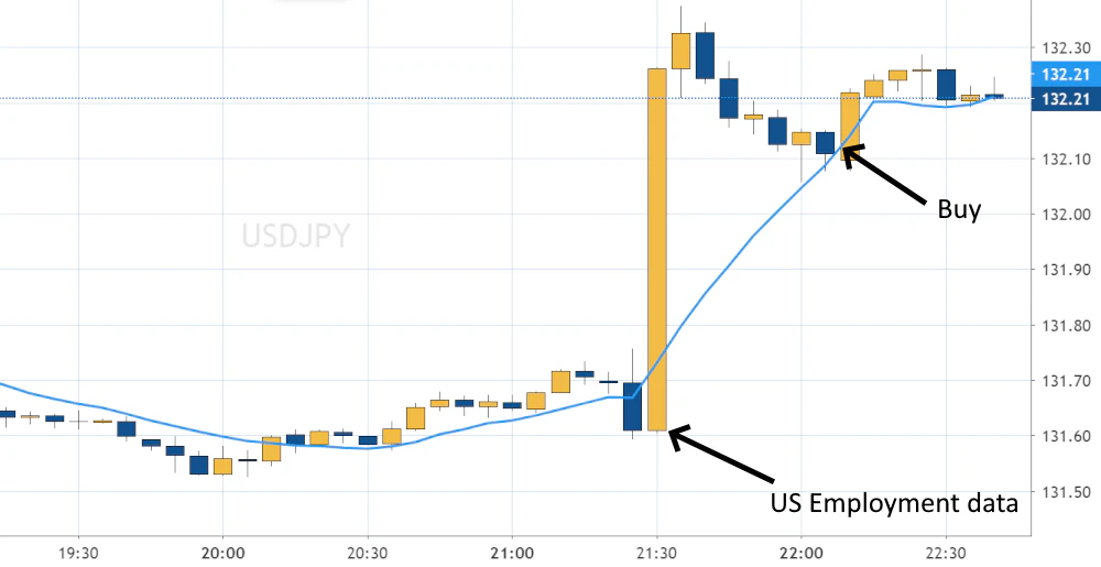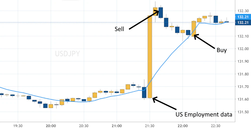 Traders using this strategy wait for the initial wave of activity to subside and then enter the market, often betting against the market's initial direction. This contrarian approach can be profitable if the market overreacts and prices correct themselves. However, if the initial reaction was justified, the market could continue in the same direction, resulting in losses. Thus, similar to trading on the news, this strategy also demands effective risk management, a solid understanding of potential market reactions, and excellent timing. A one-minute chart is helpful to trade this strategy as it will help find quick entry points.