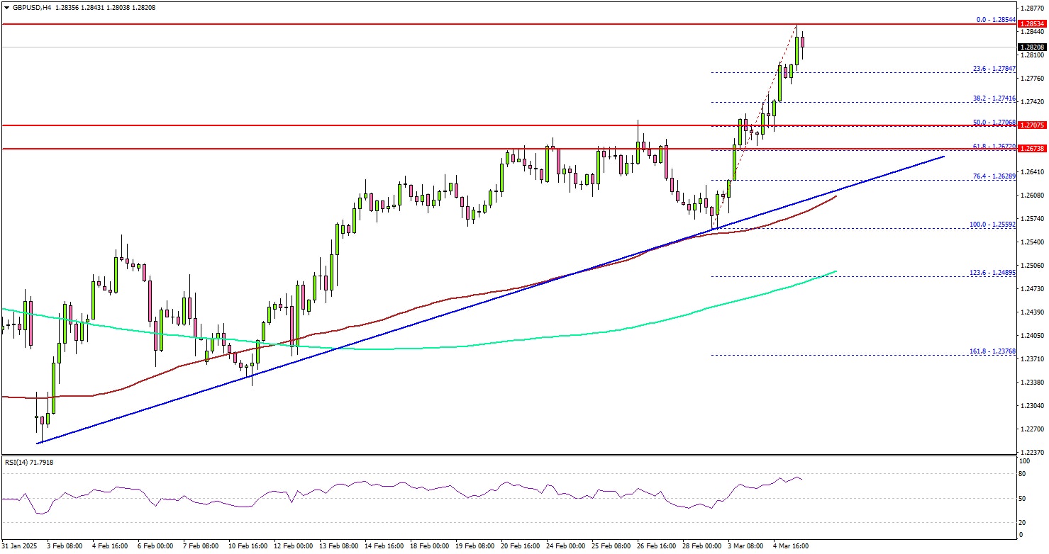 It tested the 1.2850 resistance. On the upside, the pair seems to be facing hurdles near the 1.2850 level. The next major resistance is near the 1.2880 level. The main resistance is now forming near the 1.2920 zone.