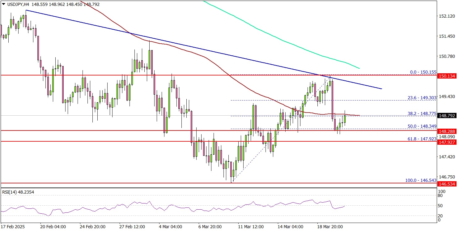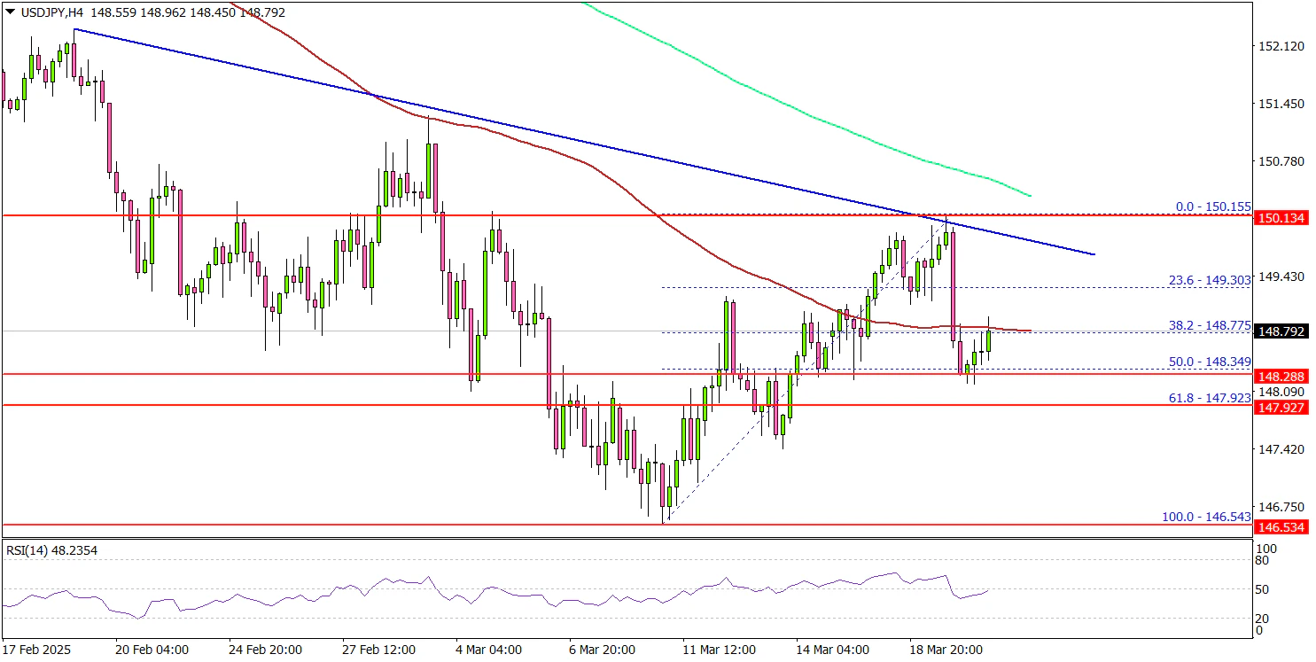 Looking at the 4-hour chart, the pair recovered some losses and traded above the 148.50 level. However, the bears were active near the 150.00 zone. A high was formed at 150.15 and the pair corrected lower.