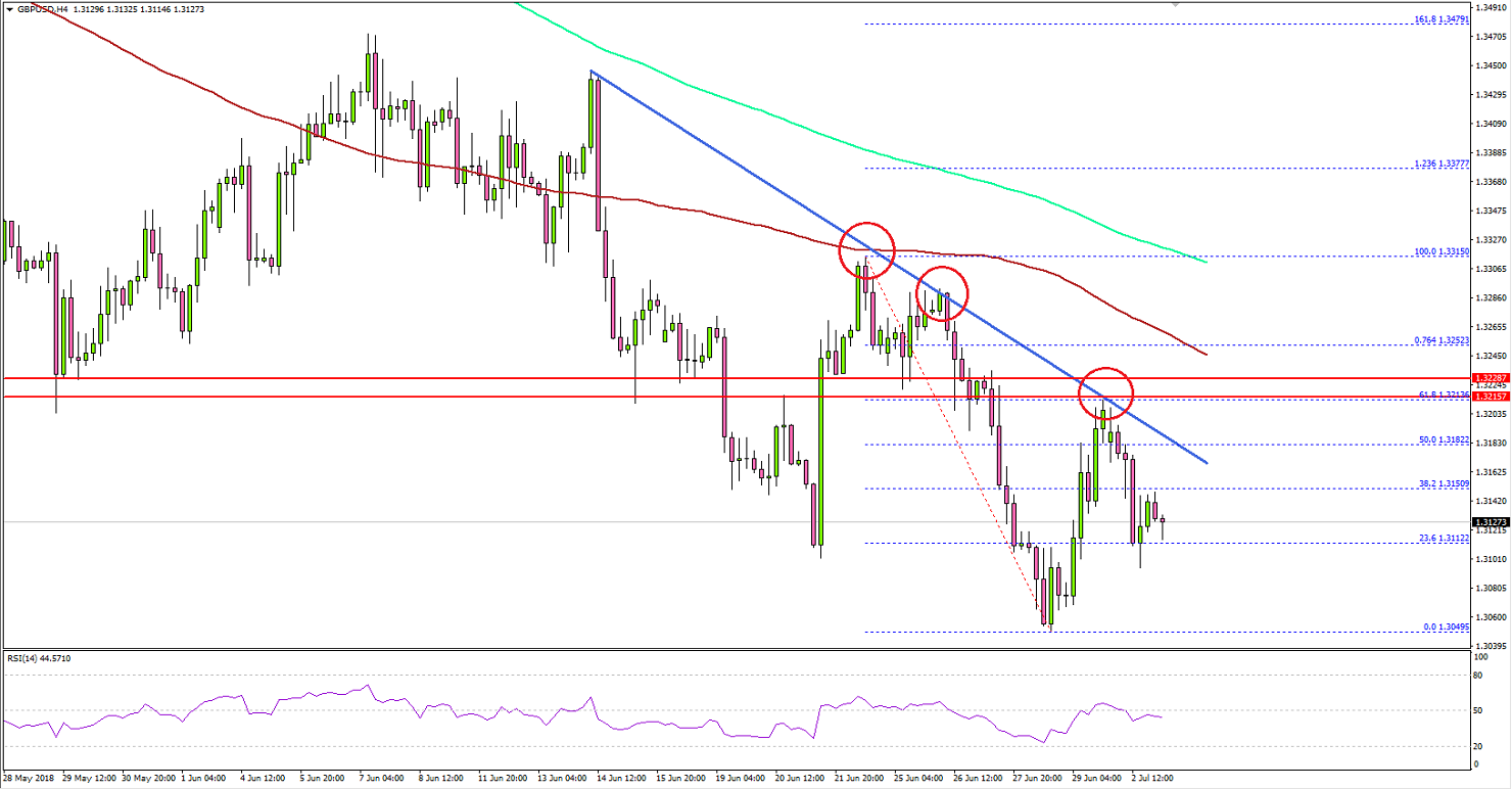 The British Pound started an upside correction from the 1.3050 swing low against the US Dollar. However, the GBP/USD pair faced a strong selling interest near 1.3200-10, resulting in a fresh decline.GBPUSD Technical Analysis British Pound US DollarLooking at the 4-hours chart, the pair formed a decent support at 1.3049 low and jumped above the 1.3100 resistance. There was also a break above the 50% Fib retracement level of the last decline from the 1.3315 high to 1.3049 low.However, the upside move was capped by the 1.3200-10 resistance zone. Moreover, a key bearish trend line with current resistance at 1.3180 also prevented gains. Lastly, the 61.8% Fib retracement level of the last decline from the 1.3315 high to 1.3049 low stopped gains.The pair started a new downside move and is currently trading well below 1.3200. On the downside, the last low of 1.3050 is a decent support. Below this, the pair may perhaps test the 1.3000 handle.Recently in the UK, the Manufacturing Purchasing Managers Index (PMI) for June 2018 was released by both the Chartered Institute of Purchasing & Supply and the Markit Economics. The market was looking for a decline from the last reading of 54.4 to 54.0.However, the result was better as the PMI came in at 54.4, but the last reading was revised to 54.3. Overall, the result was positive, but it failed to help GBP/USD.The US Dollar is once again gaining traction. Both EUR/USD and GBP/USD are showing signs of more declines, and USD/JPY is likely preparing for more gains above 111.15.