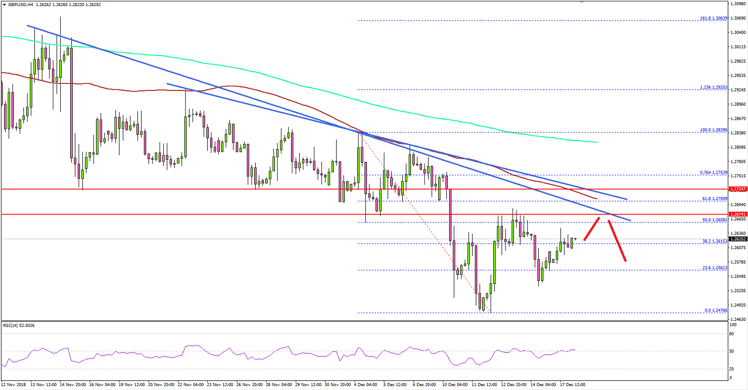 Looking at the 4-hours chart, the pair started a short term recovery from the 1.2475 support. It climbed above the 1.2500, 1.2560 and 1.2600 resistance levels. There was also a break above the 38.2% Fib retracement level of the last decline from the 1.2839 high to 1.2476 low.However, the pair is facing a solid resistance near the 1.2675 and 1.2700 levels plus the 100 simple moving average (red, 4-hours). More importantly, there are two important bearish trend lines in place with resistance near 1.2700.Therefore, it won’t be easy for buyers to clear the 1.2700 hurdle in the short term. Above 1.2700, the pair is likely to move into a positive zone and it could climb towards 1.2800 or even 1.2850.On the downside, the 1.2560 level is an initial support, below which there is a risk of more losses towards 1.2500 or 1.2475.Fundamentally, the Euro Zone CPI figure was released by the Eurostat. The market was looking for a decline of 0.2% in the CPI in Nov 2018 compared with the previous month.The result was similar to the forecast, but the Core CPI fell 0.3% in Nov 2018, which was more than the market expectation of -0.2%. The Core CPI yearly change was +1.9%, less than the forecast of 2%. The report stated that: