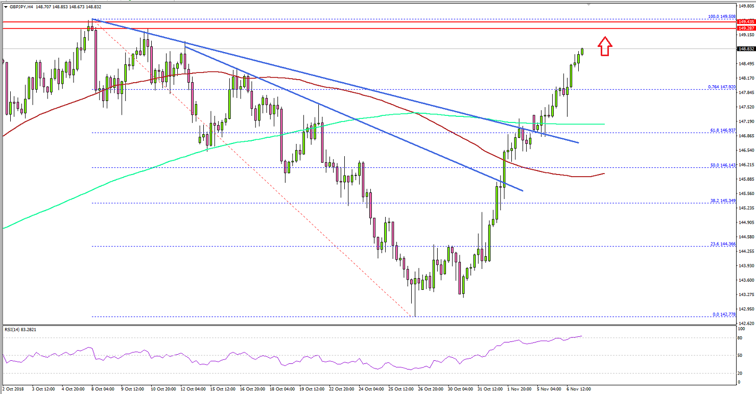 The British Pound started a solid upward move from the 142.80 support area against the Japanese Yen. The GBP/JPY pair rallied above the 145.00 and 146.00 resistance levels to move into a positive area.GBPJPY Technical Analysis British Pound Japanese YenLooking at the 4-hours chart, the pair moved higher after trading as low as 142.77. It broke many resistances near 145.00 and settled above the 200 simple moving average (4-hours, green).During the rise, there was a break above two bearish trend lines with resistance at 145.60 and 146.90 on the same chart. Besides, the pair broke the 76.4% Fib retracement level of the last major drop from the 149.50 high to 142.77 low.It means there are high chances that the pair could continue to move higher towards the last swing high at 149.50, which is a significant hurdle for buyers. Above 149.50, the pair will most likely rally above the 150.00 handle.If there is a downside correction, an initial support is near the 147.20 level and the 200 simple moving average (4-hours, green). Below the 200 SMA, the pair may well correct towards the 146.00 support and the 100 simple moving average (4-hours, red).The overall price action is positive and it seems like both GBP/USD and GBP/JPY may perhaps continue to recover in the near term.
