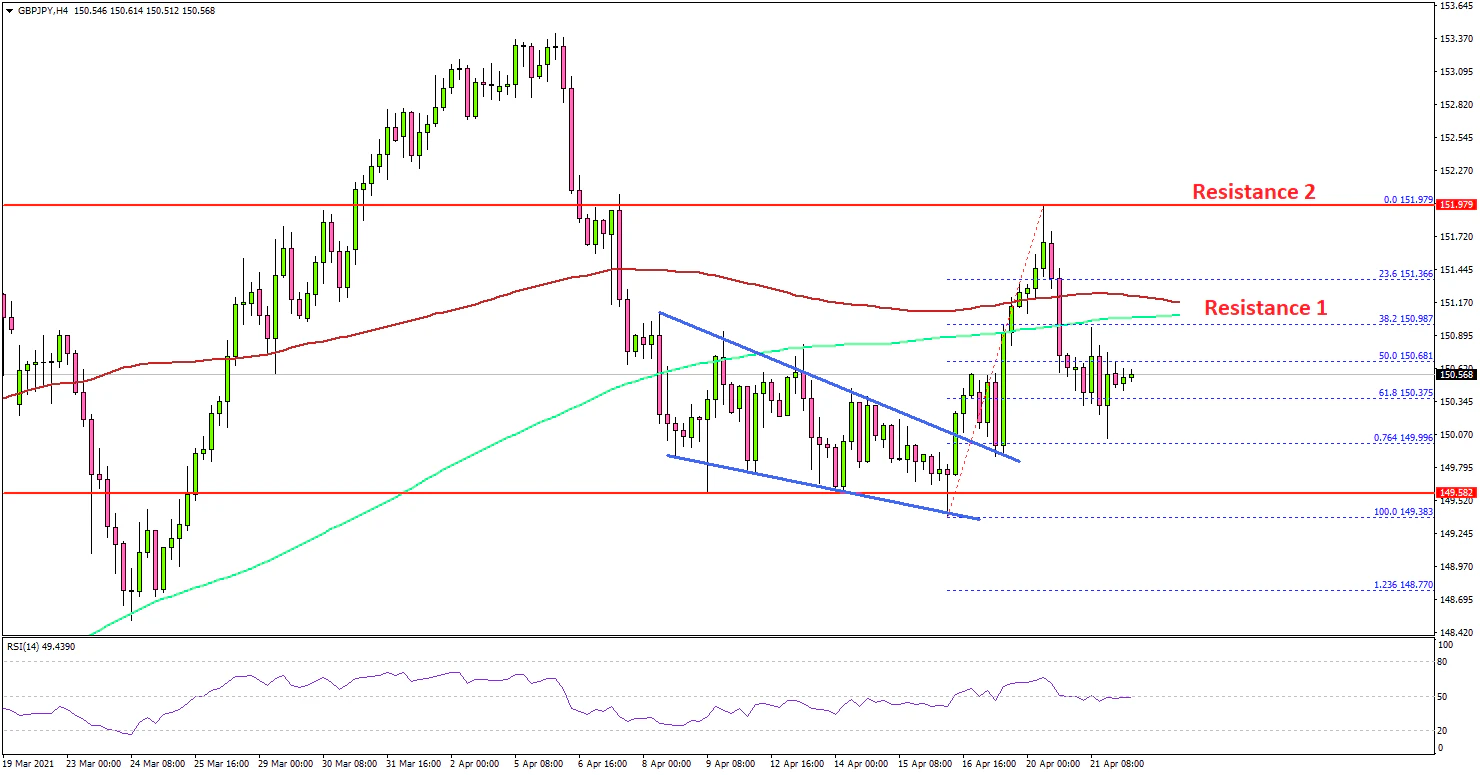 • Many hurdles are forming near 151.00 and 151.30 on the 4-hours chart.