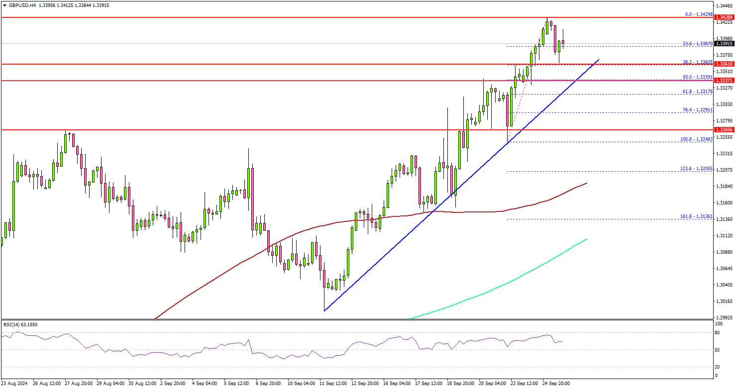 The pair even tested the 1.3430 level before a minor pullback. On the downside, immediate support sits near the 1.3360 level. There is also a key bullish trend line forming with support at 1.3360 on the same chart, below which the pair might test 1.3280.