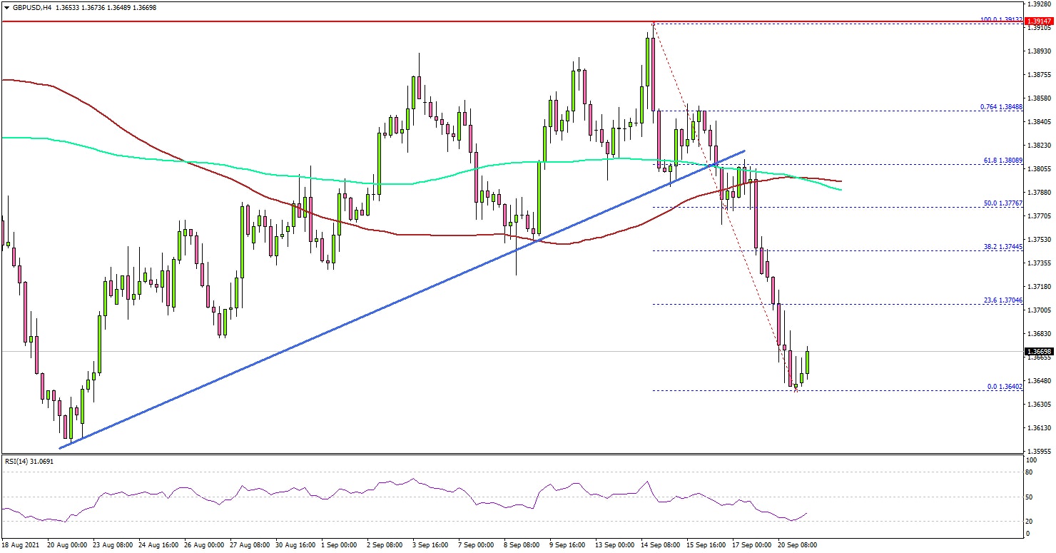 The pair gained pace below the 1.3750 level, the 100 simple moving average (red, 4-hours), and the 200 simple moving average (green, 4-hours). It even traded below the 1.3700 level.