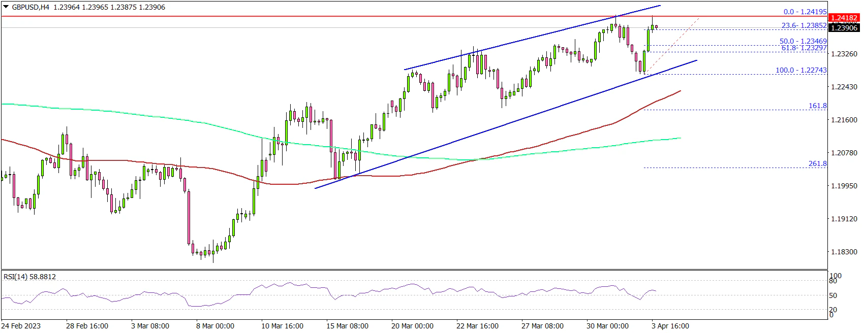 - A key rising channel is forming with support near 1.2300 on the 4-hours chart.