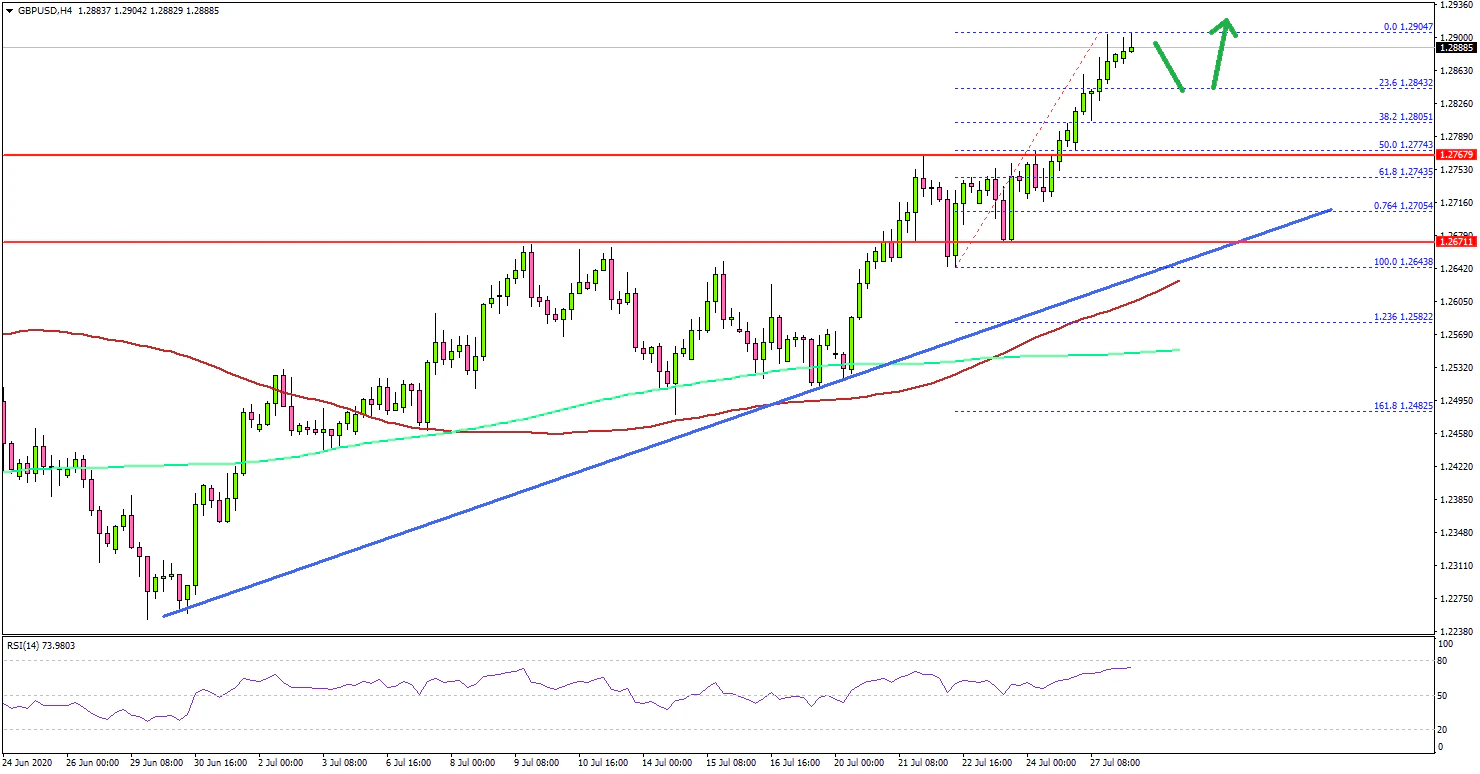 There is also a crucial bullish trend line forming with support near 1.2720 on the same chart. On the upside, the 1.2900 resistance zone is an initial barrier. A successful close above 1.2900 may perhaps lead the pair towards the 1.3000 resistance.