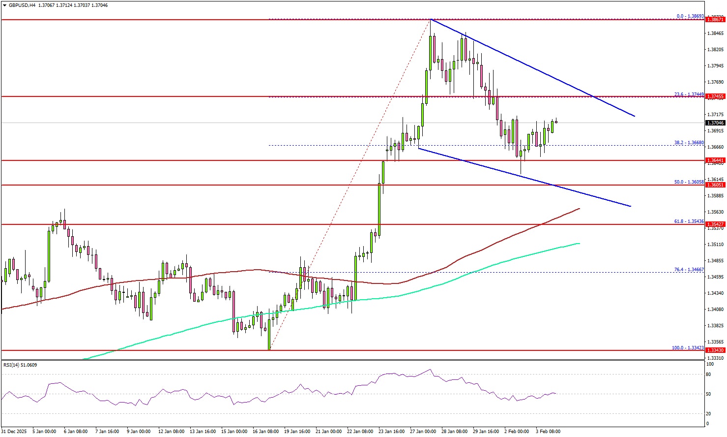 - A declining channel or a possible bullish flag is forming with support at 1.3600 on the 4-hour chart.