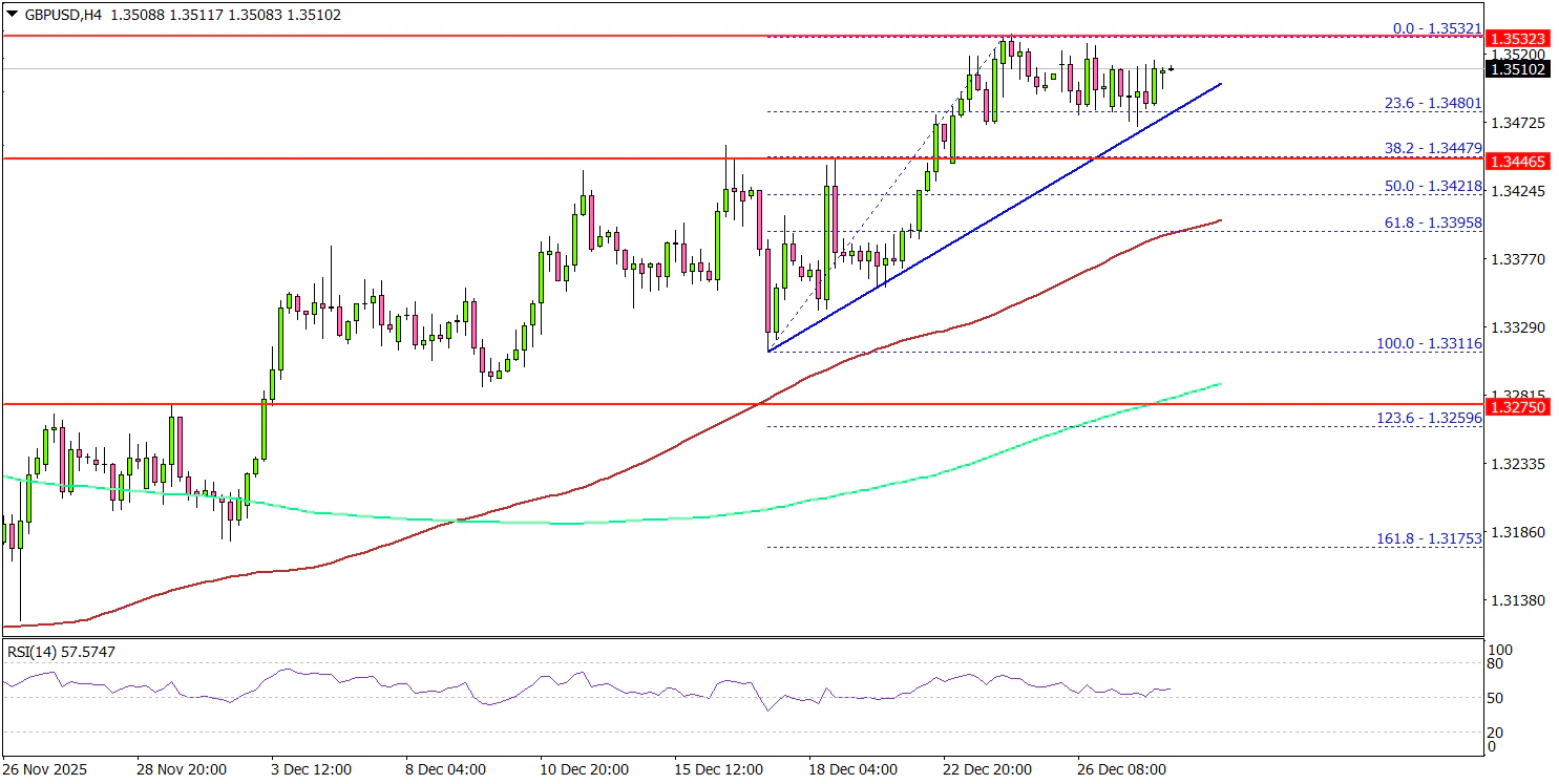 - A short-term bullish trend line is forming with support at 1.3480 on the 4-hour chart.