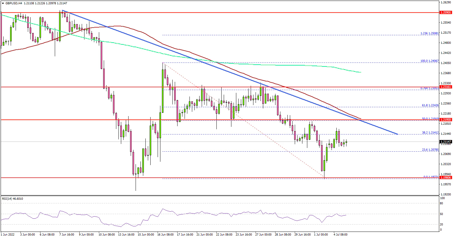 The trend line is near the 50% Fib retracement level of the downward move from the 1.2406 swing high to 1.1977 low. A close above the 1.2200 zone, trend line, and the 100 simple moving average (red, 4-hours) could start a recovery wave.