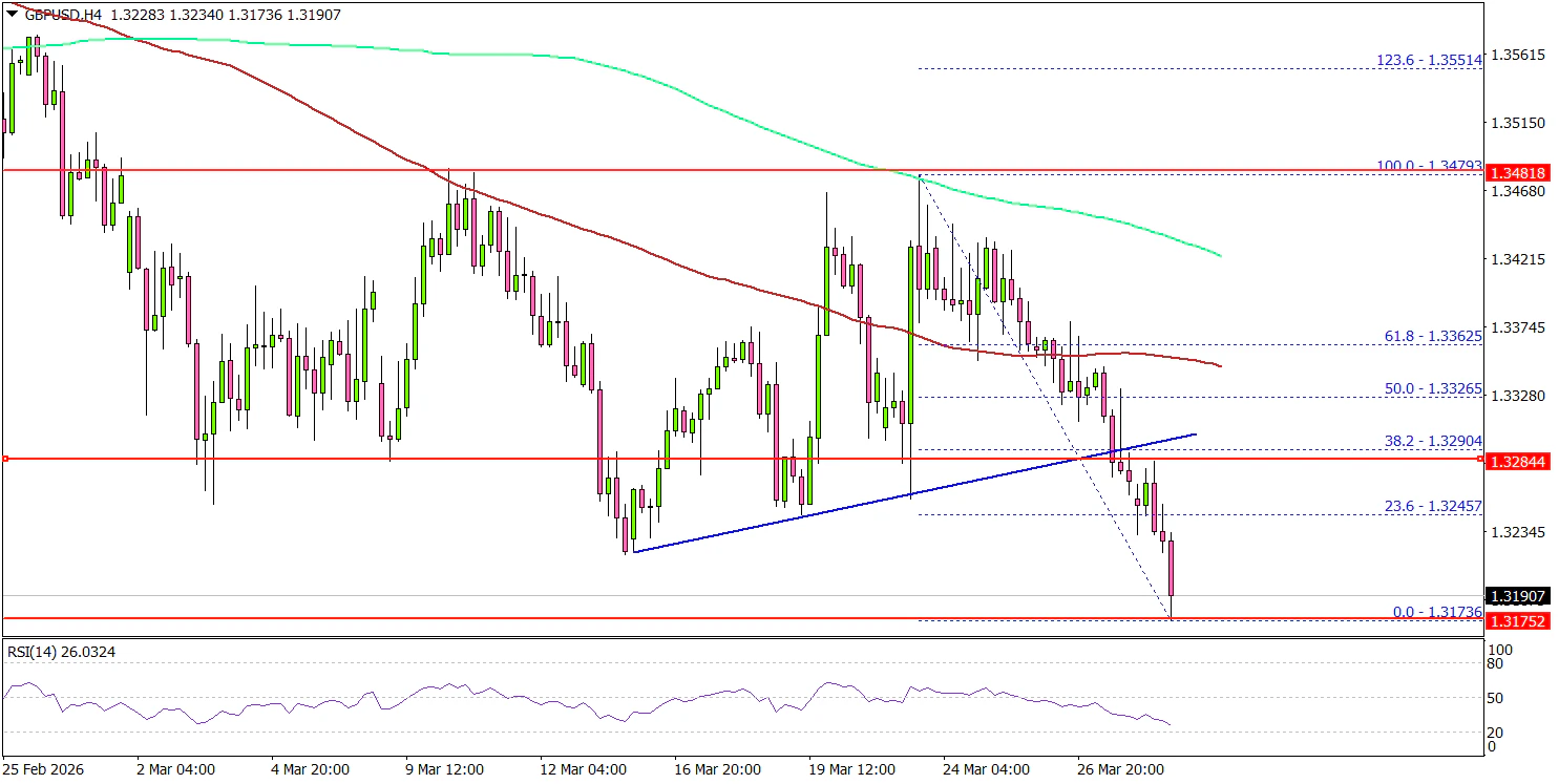 - It traded below a bullish trend line with support at 1.3290 on the 4-hour chart.