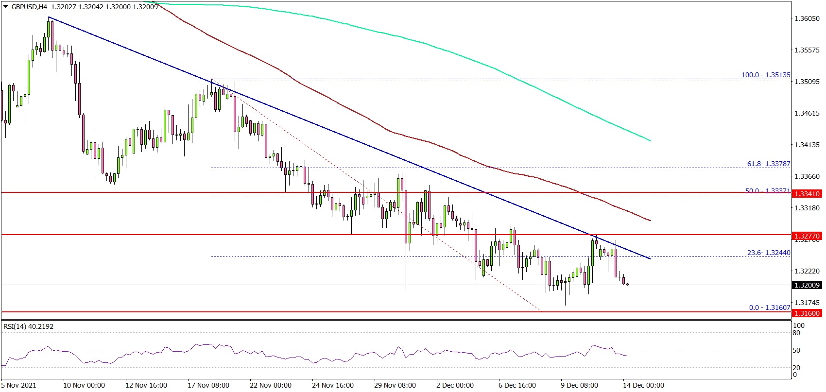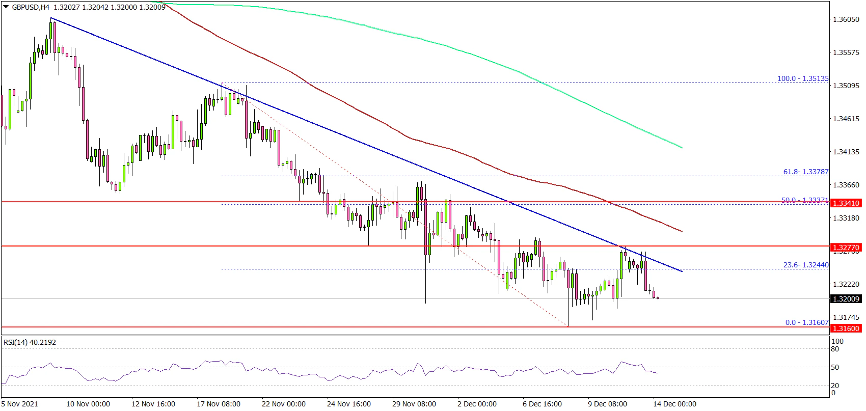 Looking at the 4-hours chart, the pair settled below the 1.3300 resistance zone. There was also a break below the 1.3200 level, and a close below the 100 simple moving average (red, 4-hours) and the 200 simple moving average (green, 4-hours).