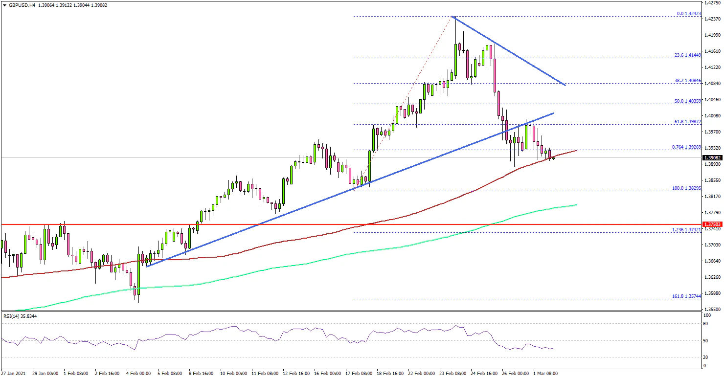 An immediate support is near the 1.3900 zone and the 100 simple moving average (red, 4-hours). The next major support is near the 1.3800 level and the 200 simple moving average (green, 4-hours).