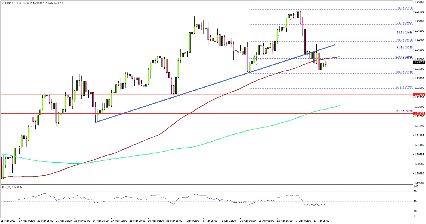 - It traded below a major bullish trend line with support near 1.2410 on the 4-hour chart.