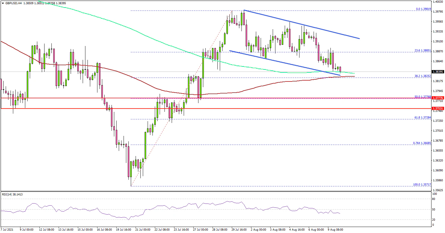 Looking at the 4-hours chart, the pair also traded below the 1.3900 support. There was a break below the 23.6% Fib retracement level of the upward move from the 1.3571 swing low to 1.3981 high.