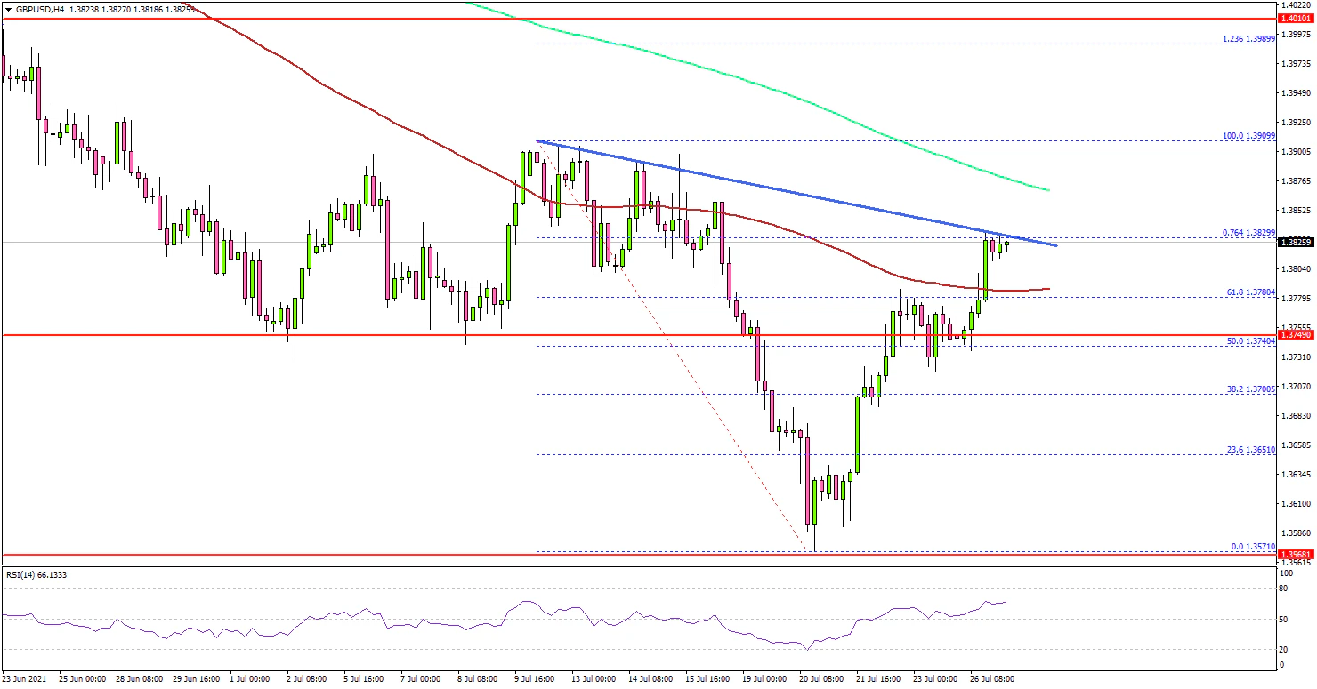There was a clear break above the 50% Fib retracement level of the key decline from the 1.3909 swing high to 1.3571 low. The pair even climbed above the 1.3800 level and the 100 simple moving average (red, 4-hours).