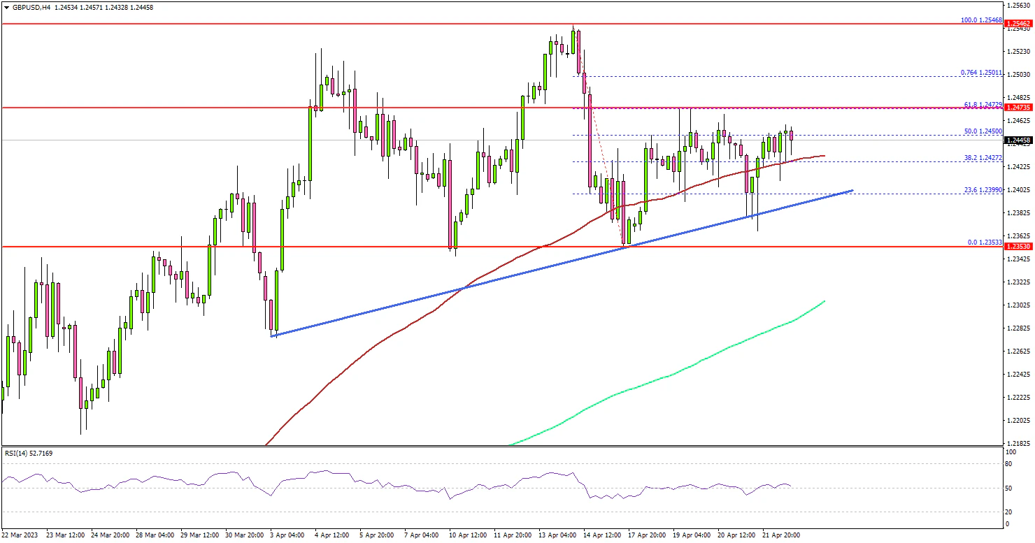 Looking at the 4-hour chart, the pair tested the 1.2350 support zone. A low was formed near 1.2353 before the price started a fresh increase. The pair climbed above the 1.2420 level and the 100 simple moving average (red, 4 hours).