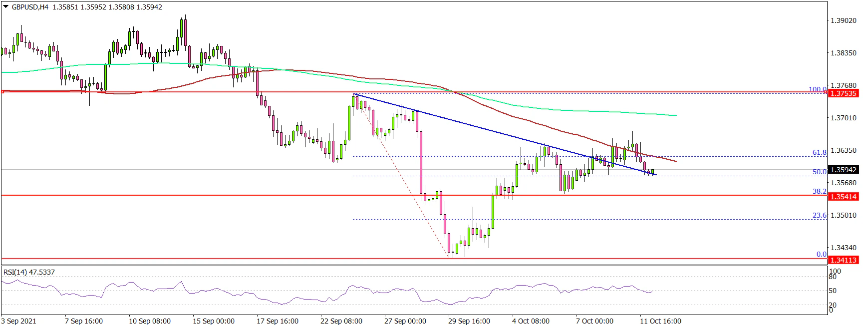 • It surpassed a bearish trend line at 1.3590 on the 4-hours chart.