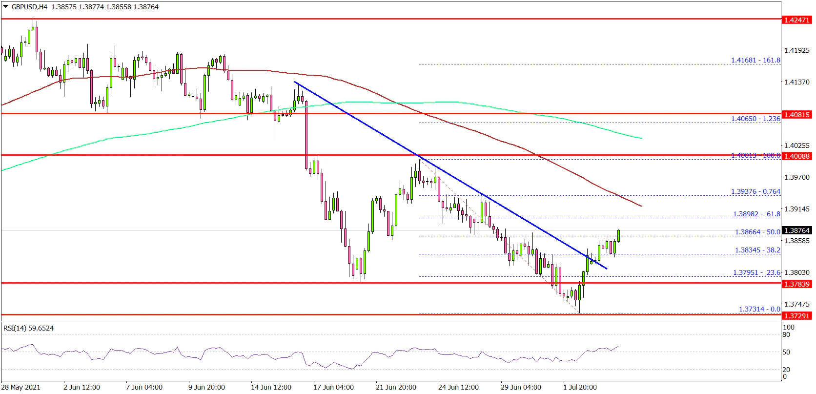 • There was a break above a major bearish trend line with resistance near 1.3810 on the 4-hours chart.