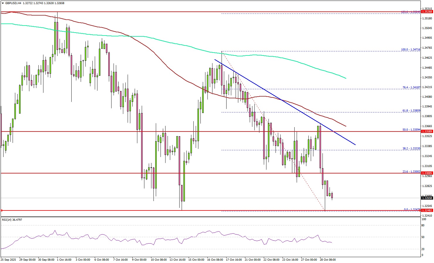 - GBP/USD started a fresh decline below 1.3350 and 1.3320.