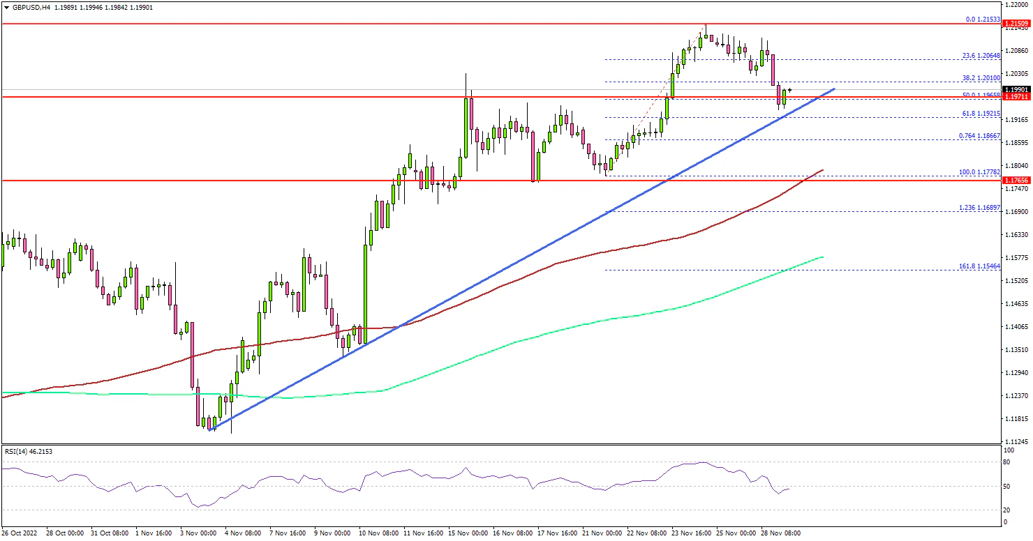 Any more losses might send the pair towards the 1.1850 support zone. On the upside, the pair might gain bullish momentum once it settles above the 1.2150 level.