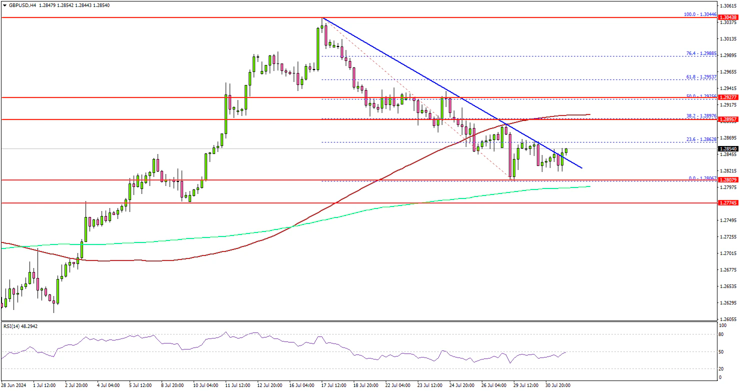 Looking at the 4-hour chart, the pair tested the 1.2800 support zone and remained stable above the 200 simple moving average (green, 4-hour). A low was formed at 1.2806 and the pair is now attempting a recovery wave.
