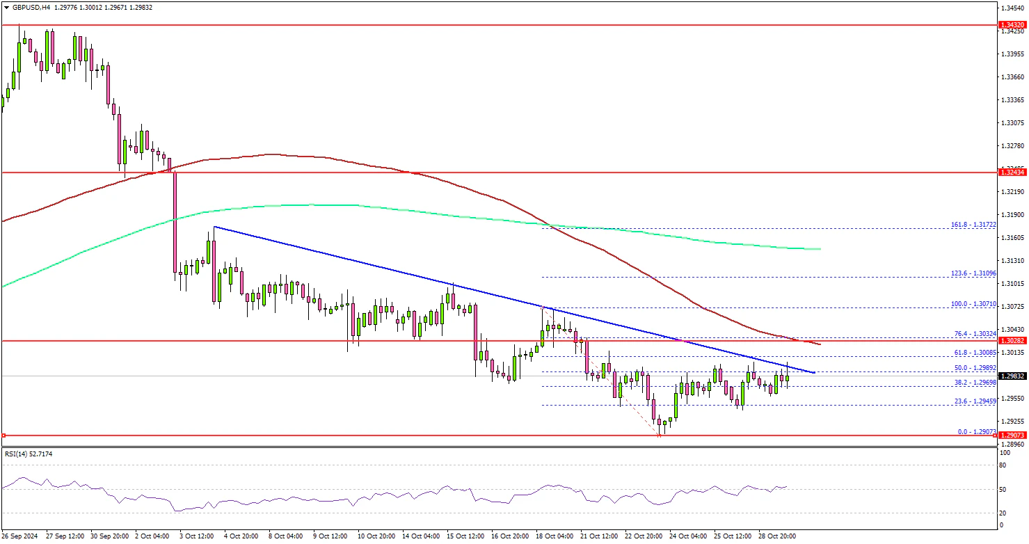 On the upside, the pair could face resistance near the 1.2990 level. There is also a key bearish trend line forming with resistance at 1.2990 on the same chart. The first key resistance is near the 1.3035 level and the 50% Fib retracement level of the downward move from the 1.3070 swing high to the 1.2907 low.