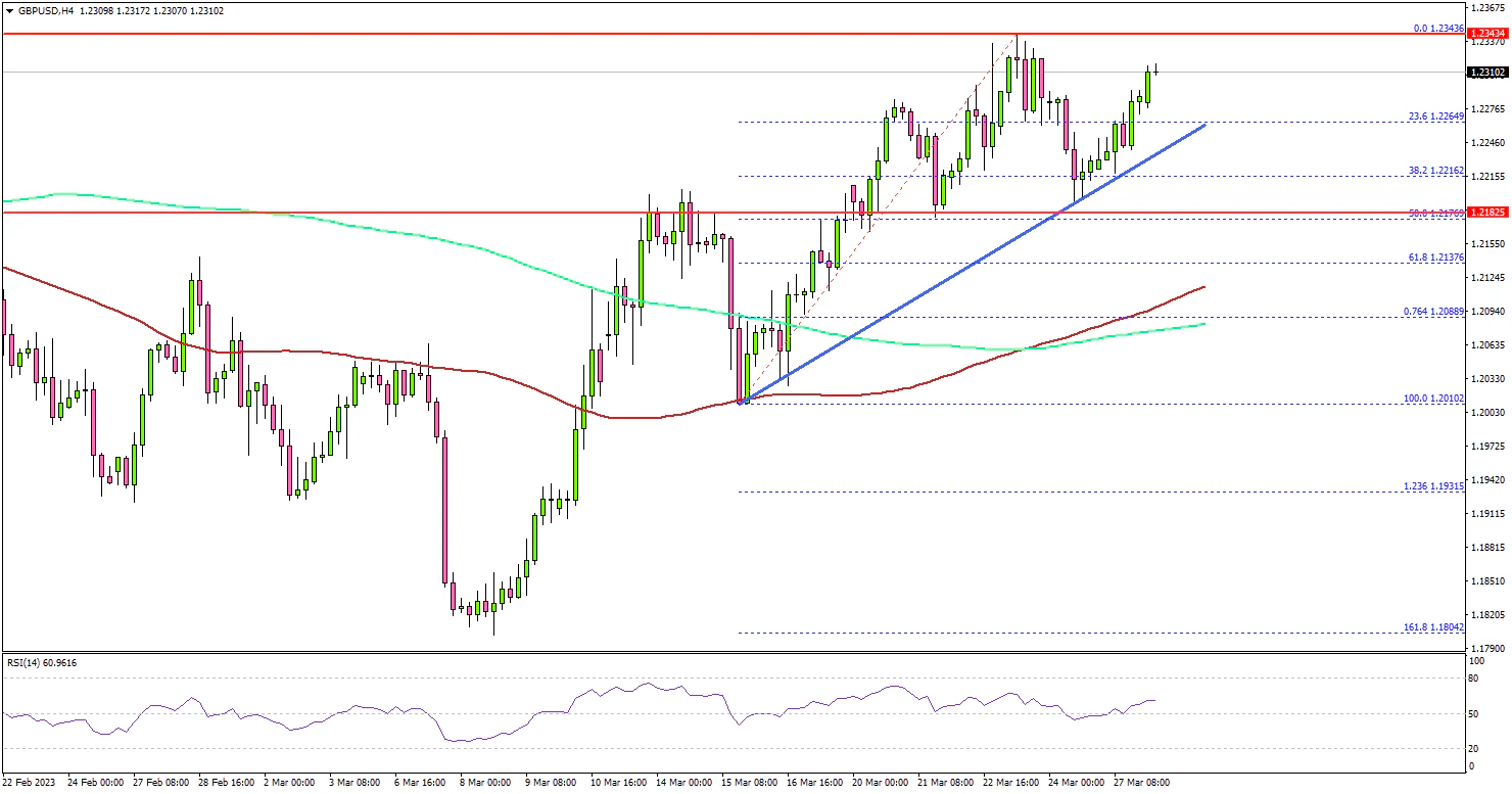 Looking at the 4-hours chart, the pair even settled above the 1.2200 level, the 100 simple moving average (red, 4-hours) and the 200 simple moving average (green, 4-hours). It traded towards 1.2350 before there was a downside correction.