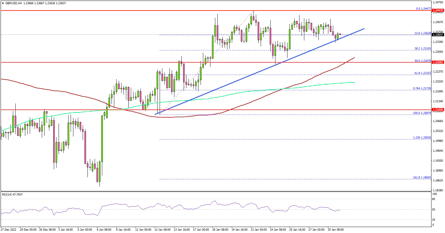 - A key bullish trend line is forming with support near 1.2350 on the 4-hours chart.