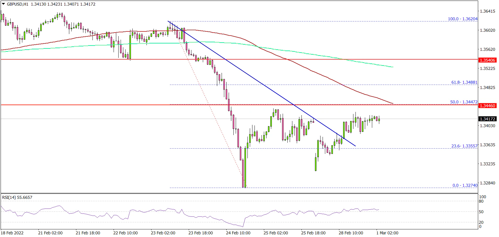 On the upside, the pair is facing a strong resistance near the 1.3440 and 1.3450 levels. It is near the 50% Fib retracement level of the downward move from the 1.3620 swing high to 1.3274 low. The next major resistance sits near the 1.3480 zone and the 100 simple moving average (red, 4-hours).