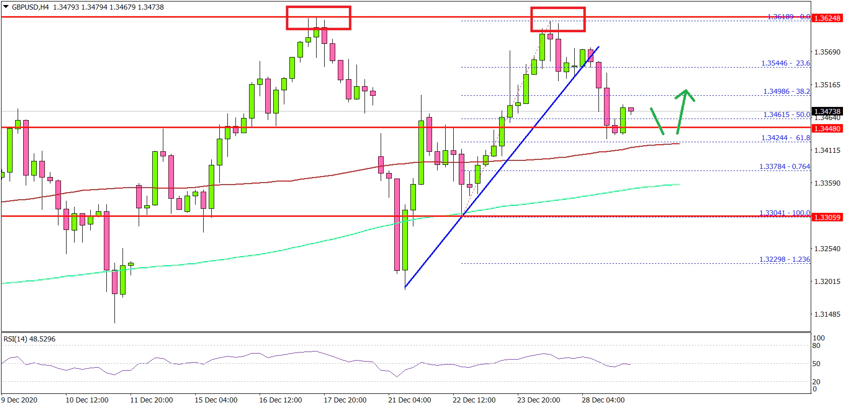 Any more losses could lead the pair towards the 1.3420 support and the 100 SMA. On the upside, an initial resistance is near the 1.3560 level. The main resistance is near the 1.3600-1.3620 zone. A close above the 1.3620 level is must for upside continuation.