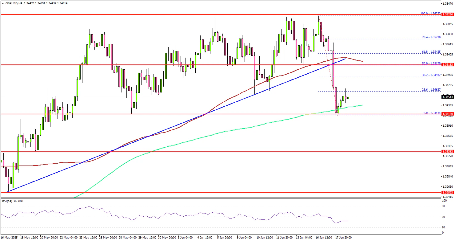 - It traded below a bullish trend line with support at 1.3515 on the 4-hour chart.