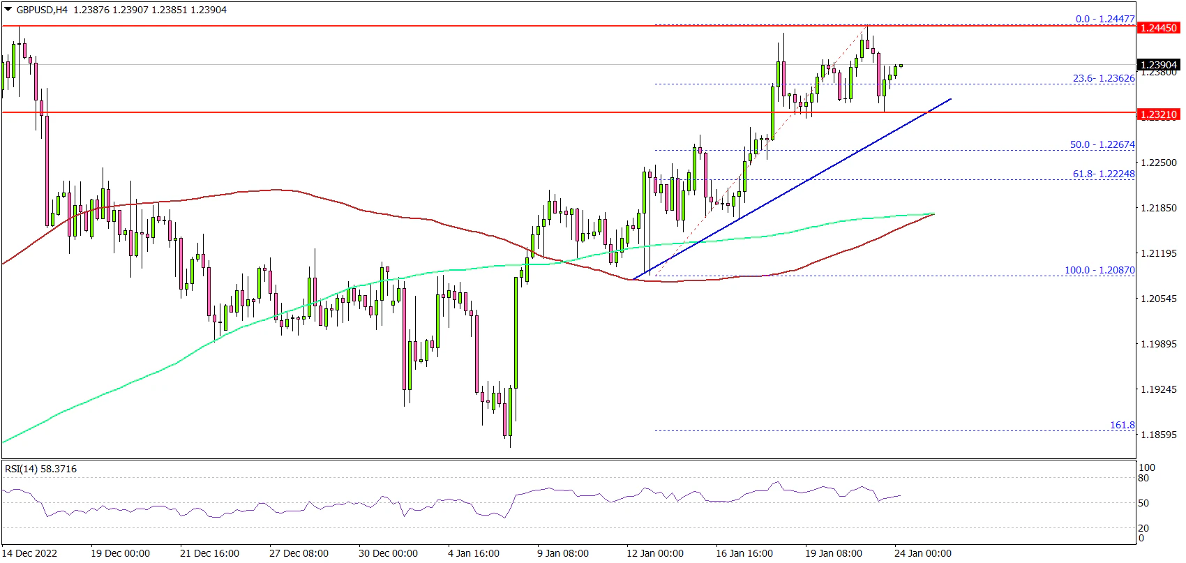 - A connecting bullish trend line is forming with support near 1.2340 on the 4-hours chart.