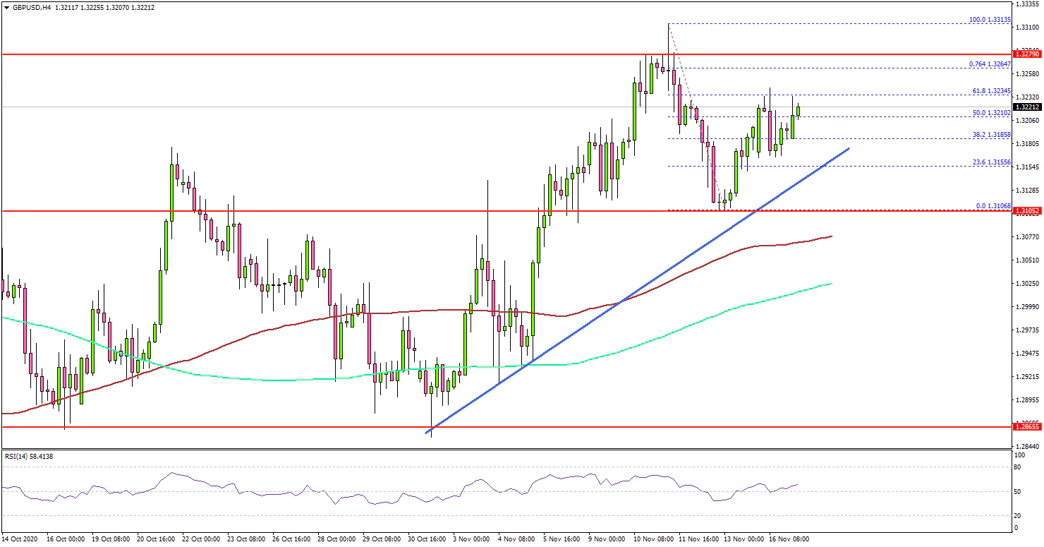 A low was formed near 1.3106 and the pair climbed above 1.3180. The pair even broke the 50% Fib retracement level of the downward move from the 1.3313 high to 1.3106 low.