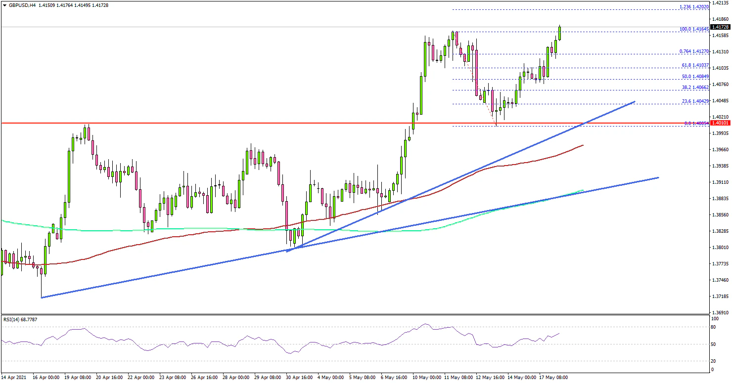 It also remained well above the 100 simple moving average (red, 4-hours) and the 200 simple moving average (green, 4-hours). A low was formed near 1.4005 and the pair is now trading above 1.4100.