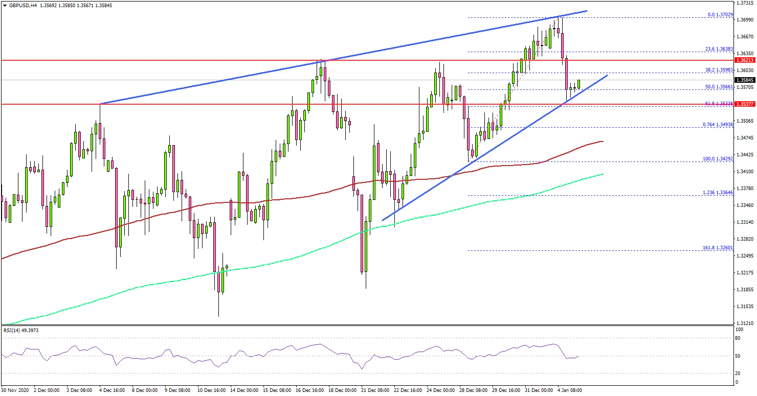 Looking at the 4-hours chart, the pair failed to gain pace above the 1.3700 zone. Besides, it seems like a key resistance trend line protected gains above 1.3700. The pair corrected lower and traded below 1.3600.