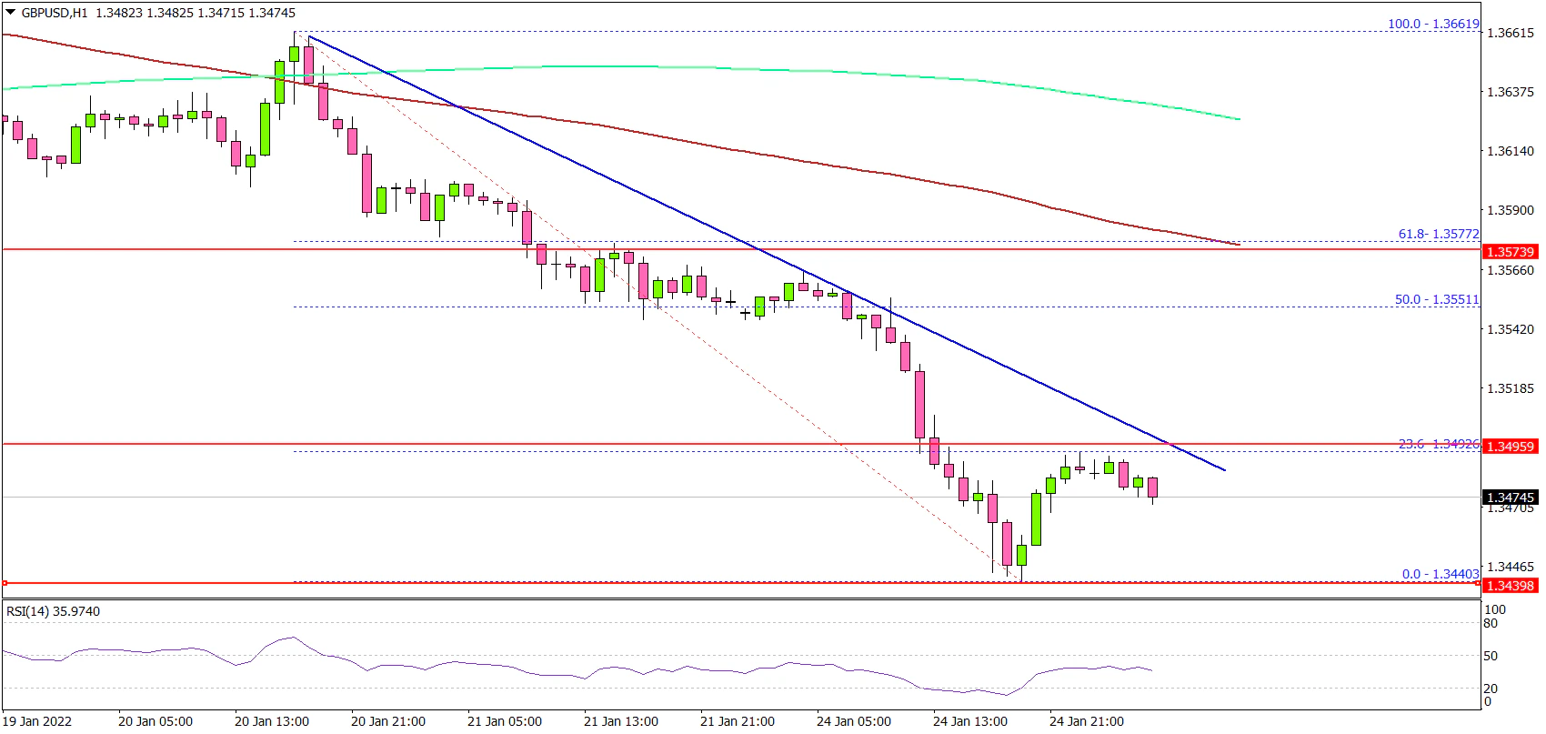 It traded as low as 1.3444 and currently consolidating losses. On the upside, the pair is facing resistance near 1.3490 and 1.3500 levels.