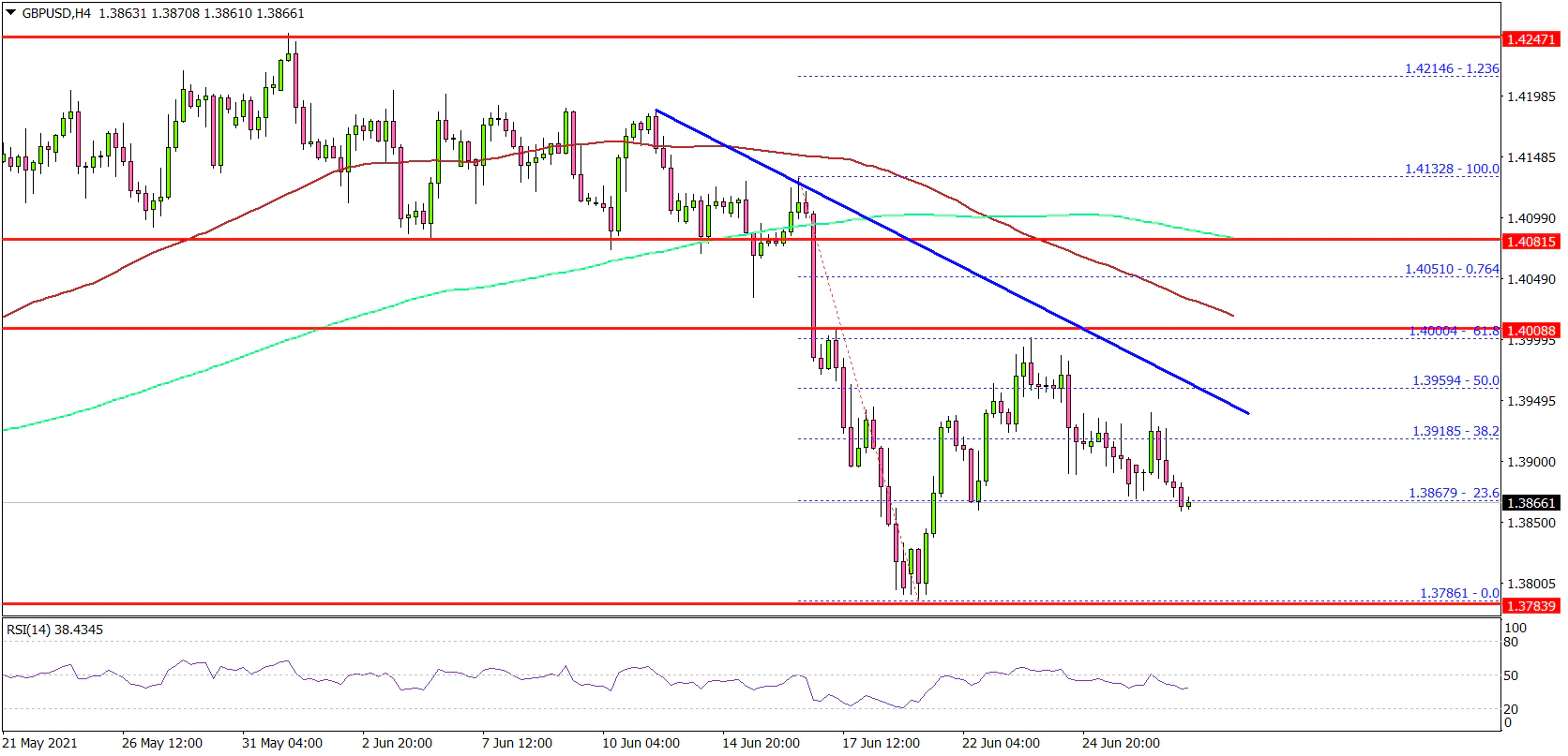 However, the pair failed to break the 1.4000 resistance. It also remained well below the 100 simple moving average (red, 4-hours) and the 200 simple moving average (green, 4-hours).