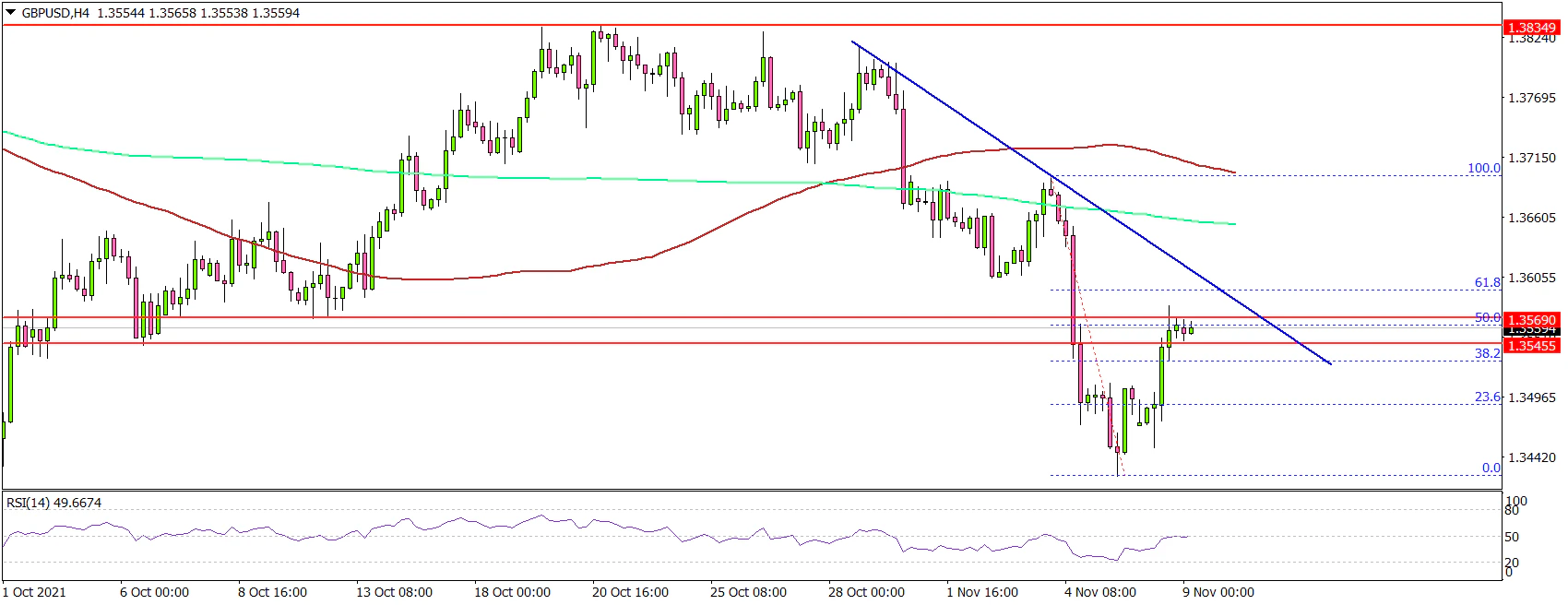 Looking at the 4-hours chart, the pair even traded below the 1.3550 support, the 100 simple moving average (red, 4-hours), and the 200 simple moving average (green, 4-hours).