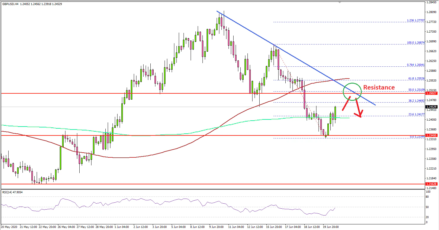 - A key bearish trend line is forming with resistance near 1.2500 on the 4-hours chart.