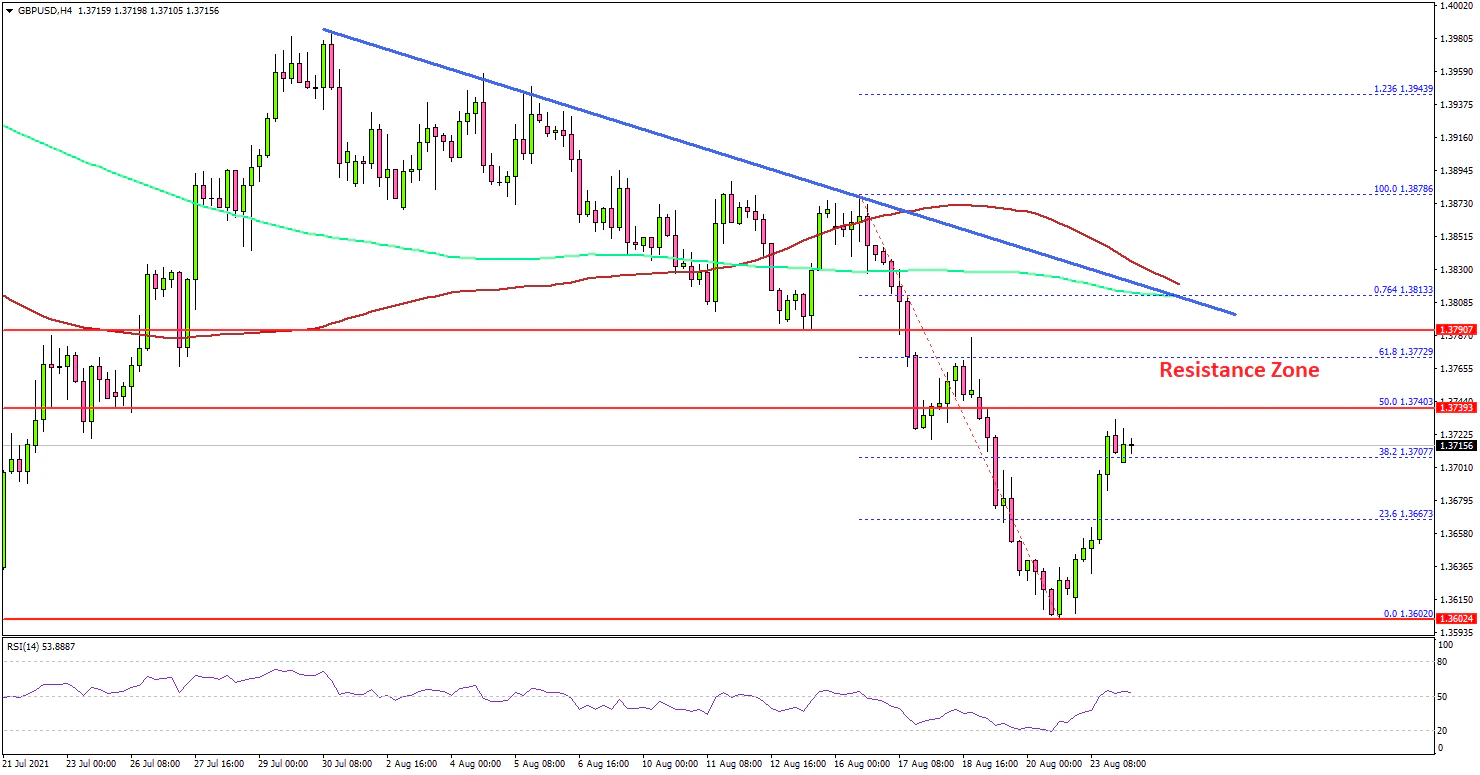 The British Pound extended its decline to 1.3600 before it started an upside correction against the US Dollar. GBP/USD recovered above 1.3700, but it could face many hurdles.