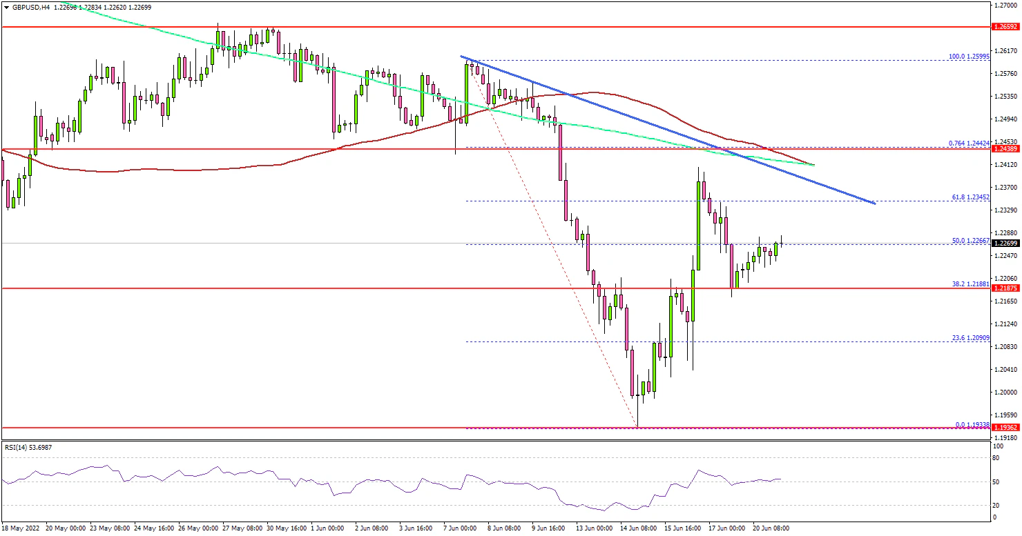 Looking at the 4-hours chart, the pair traded as low as 1.1933. It started an upside correction and traded above the 1.2100 resistance zone. There was a move above the 50% Fib retracement level of the downward move from the 1.2599 swing high to 1.1933 low.