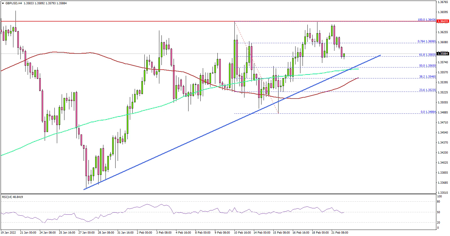 • A crucial bullish trend line is forming with support near 1.3580 on the 4-hours chart.