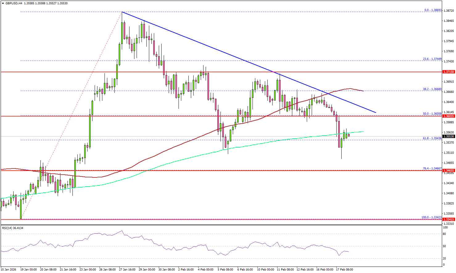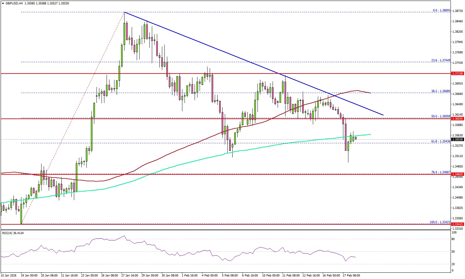 - A key bearish trend line is forming with resistance at 1.3640 on the 4-hour chart.